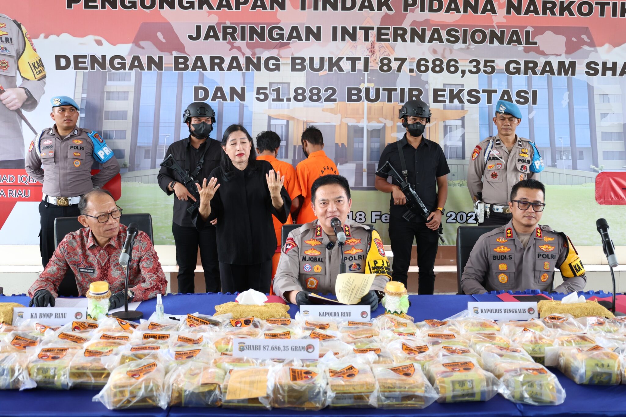 Polda Riau berhasil mengungkap jaringan narkotika internasional dengan barang bukti bukti 87,686 kg sabu dan 51.882 butir pil ekstasi.