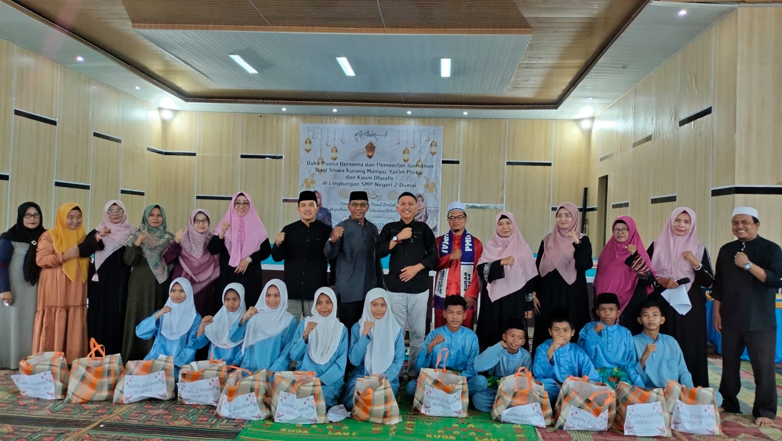 DUMAI(DUMAIPOSNEWS)- SMP Negeri 2 Dumai mengadakan kegiatan buka puasa bersama dan pemberian santunan bagi siswa kurang mampu, yatim piatu dan kaum dhuafa dilingkungan SMPN 2 Dumai, Rabu (19/3) di Aula SMPN 2 Dumai. Kegiatan yang mengangkat tema ‘Ramadhan penuh berkah wujudkan kepedulian tebarkan kebahagiaan’ ini dihadiri oleh Asisten II Perekonomian dan Pembangunan Setdako Dumai H Syahrinaldi SSos MSi.