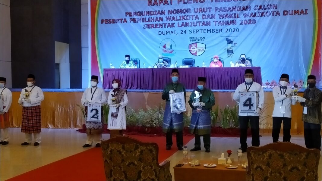 DUMAI (DUMAIPOSNEWS.COM) - Pesta Demokrasi Pemilihan Walikota dan Wakil Walikota (Pilwako) Kota Dumai semakin dekat. Komisi Pemilihan Umum (KPU) Kota Dumai selesai dan telah menetapkan No Urut Pasangan Calon (Paslon) Walikota dan Wakil Walikota periode 2021-2024 pada Kamis (24/09/2020) di Ballroom Hotel Comforta Dumai.