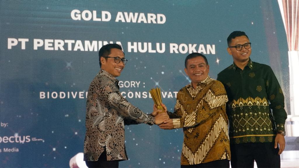 Mewakili Pertamina Hulu Rokan, Pinto Budi Laksono, Manager Corporate Social Responsibility PHR menerima penghargaan Gold dan Silver dalam kategori Biodiversity Conservation & Economic Empowerment pada ajang ISRA Award 2023 (f ist)