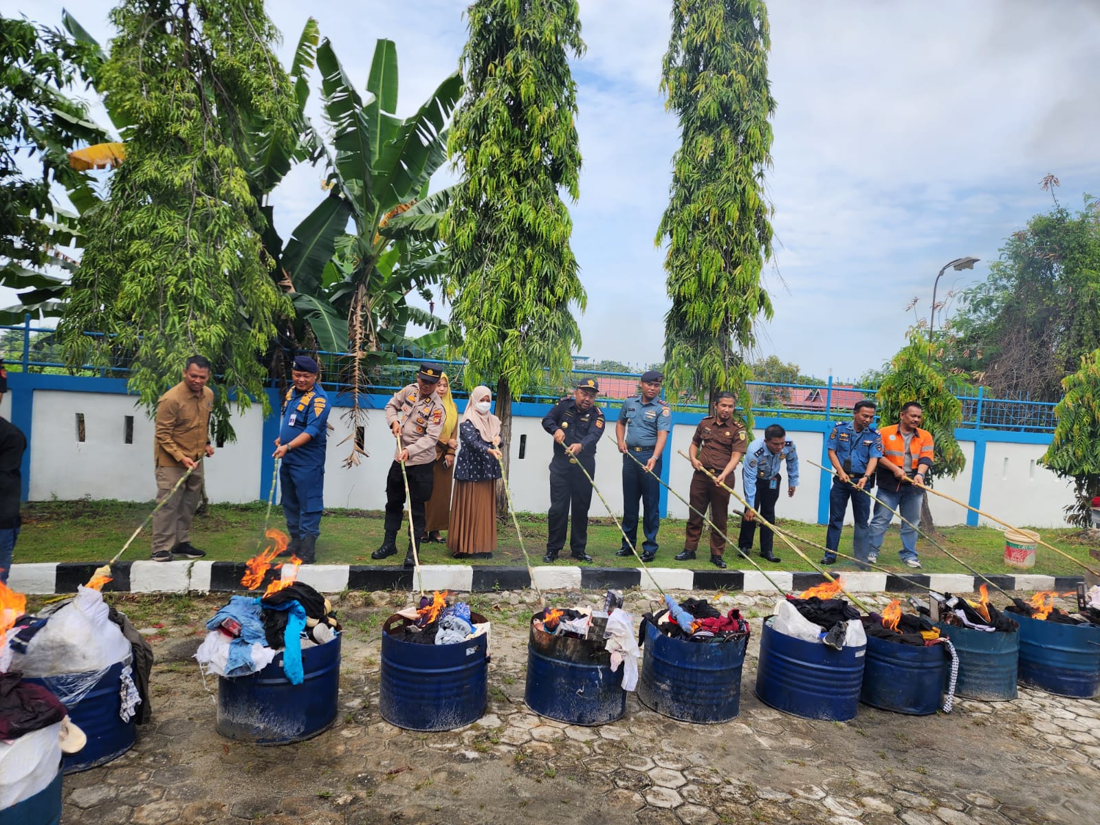 Pakaian bekas sebanyak ±28 koli dan sepatu bekas sebanyak ±150, dimusnahkan dengan cara dibakar. Merupakan hasil dari 3 penindakan dengan nilai sebesar Rp 197.000.000.