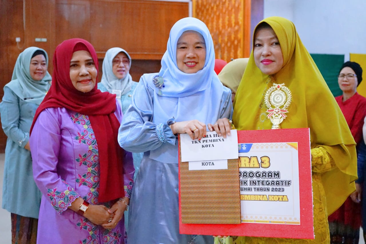 Bunda PAUD Kota Dumai Hj Leni Ramaini SKM menyerahkan hadiah kepada pemenang lomba program PAUD HI, Jumat (4/8).