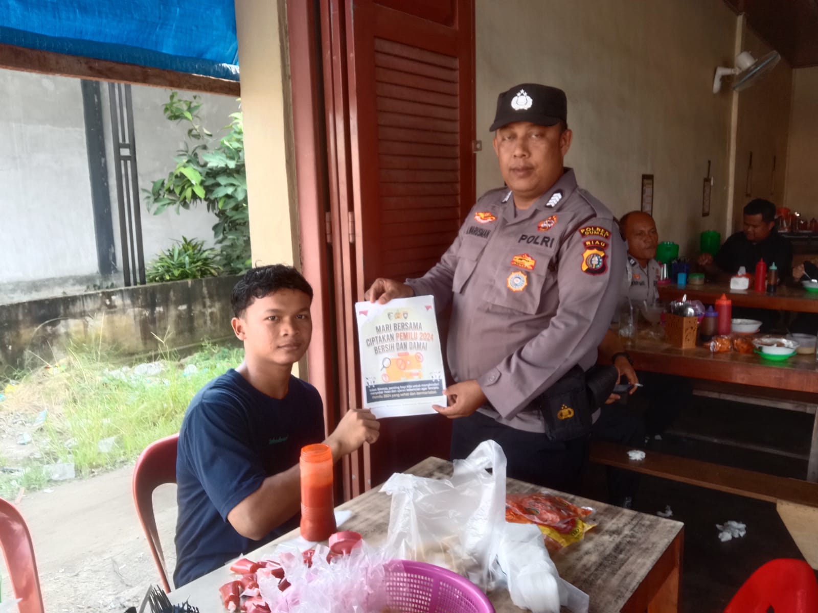 DUMAI (DUMAIPOSNEWS)- Wujud komitmen Polri dalam menciptakan Pemilu Damai 2024, Polres Dumai melalui Sat Binmas Polres Dumai melaksanakan kegiatan sosialisasi dengan menyebarkan pamflet dan brosur terkait tahapan, ketentuan dan aturan Pemilu 2024, Senin (25/12/2023).