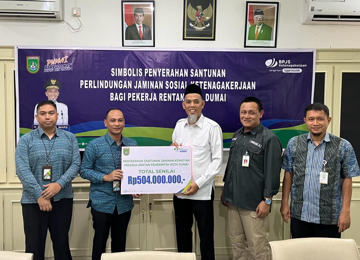 DUMAI (DUMAIPOSNEWS)- Badan Penyelenggara Jaminan Sosial ( BPJS ) Ketenagakerjaan Kota Dumai serahkan Santunan Perlindungan Jaminan Sosial dengan total Rp 504 Juta untuk 14 Orang Ahli Waris Pekerja Rentan.