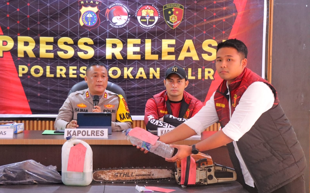 Kapolres menambahkan, bahwa Barang Bukti diamankan dari tersangka yaitu, 3 Batang Kayu bekas terbakar, 1 Unit Chainsow merk Steel, 1 unit jerigen ukuran 5 liter yang didalamnya terdapat minyak pertalite, 1 bilah babat, 1 buah mancis, 1 botol minuman bekas ukuran 1,5 liter bekas berisikan minyak Pertalite, dan 1 buah mancis.