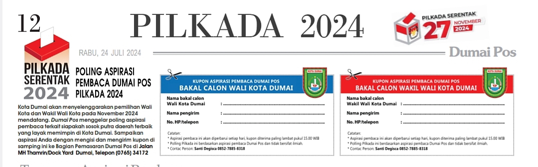 Melihat tingginya animo masyarakat menyambut pemilihan kepala daerah (Pilkada) di Riau, Harian Dumai Pos membuka poling Calon Walikota (Cawako) Dumai dan Calon Wakil Wali Kota (Cawawako) Dumai pilihan pembaca. Kupon untuk pengisian polling diterbitkan di koran Dumai Pos mulai, Rabu (24/7/2024) hari ini.