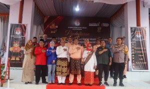 Pasangan ini diarak ribuan pendukung dengan penampilan kesenian reog Ponorogo dan barongsai. Keduanya kompak menggunakan kemeja putih didampingi istri.