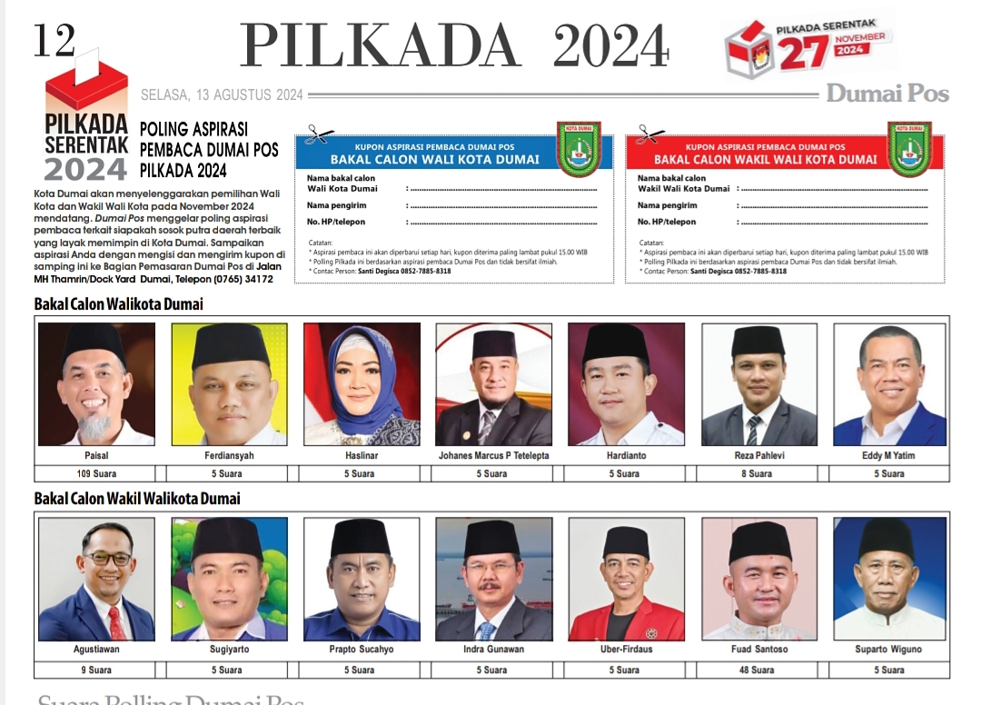 Sebanyak tujuh orang Bakal Calon (Bacalon) Walikota Dumai dan Calon Wakil Walikota Dumai akan tampil di Polling yang dilakukan Harian Dumai Pos. Polling akan ditampilkan setiap hari dan di lakukan perubahan seminggu sekali mulai 1 Agustus 2024 lalu.