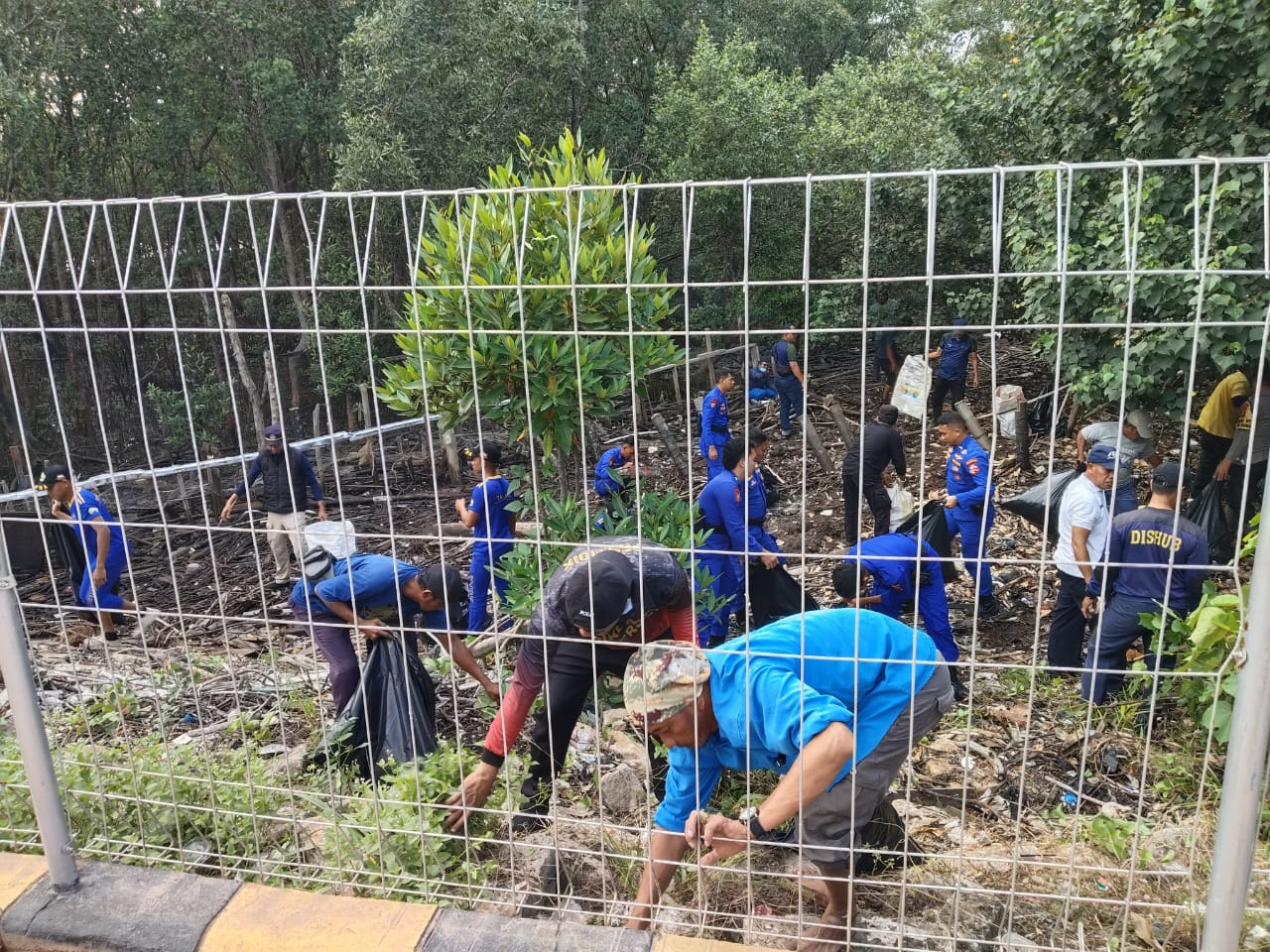 DUMAI (DUMAIPOSNEWS) – Wasatpel PP Kelas I Dumai bersama UPTD Dishub Riau, Polairud Mabes Polri dan Polairud Dumai, ASDP Indonesia perwakilan Dumai, Taruna Polteknik Kelautan dan Perikanan dan Komunitas Ojek melaksanakan gotongroyong atau jumat bersih di sepanjang pantai, Pelabuhan Bandar Sri Junjungan Dumai, Jumat (2/8/2024).