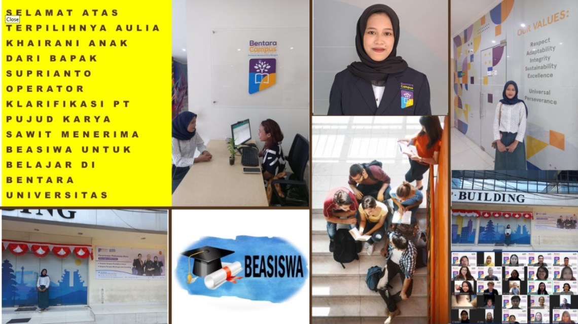 Kali ini Management PT.PKS memberikan kesempatan bagi anak karyawan yang berminat melanjutkan Study ke jenjang perguruan tinggi diantaranya beasiswa diberikan kepada siswi Aulia Khairani, Putri dari Bapak Suprianto (Op. Klarifikasi) Karyawan PT. Pujud Karya Sawit. Program D-4 di Universitas Politeknik Bentara Citra Bangsa di Jakarta.