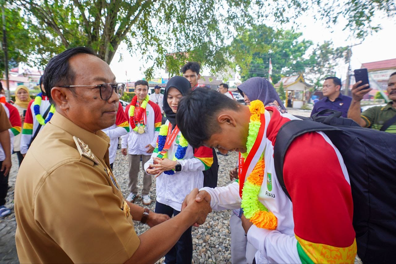 PEKANBARU (DUMAIPOSNEWS)-Pj Gubernur Riau Rahman Hadi menyambut kedatangan Atlet dan pelatih Cabang Olahraga (Cabor) Senam Riau yang berhasil meraih 6 emas, 3 perak dan 2 perunggu di Pekan Olahraga Nasional (PON) XXI Aceh-Sumut, Senin (2/9).