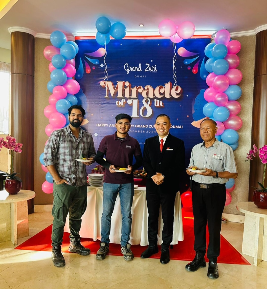DUMAI(DUMAIPOSNEWS)- Grandzuri Dumai , Salah satu hotel terkemuka di Dumai , dengan bangga merayakan ulang tahun yang ke 18 , Selasa 3 Desember, Perayaan ini menjadi momen istimewa untuk merefleksikan perjalanan panjang hotel dalam memberikan pelayanan terbaik kepada para tamu dan kontribusinya terhadap industry perhotelan di Dumai.
