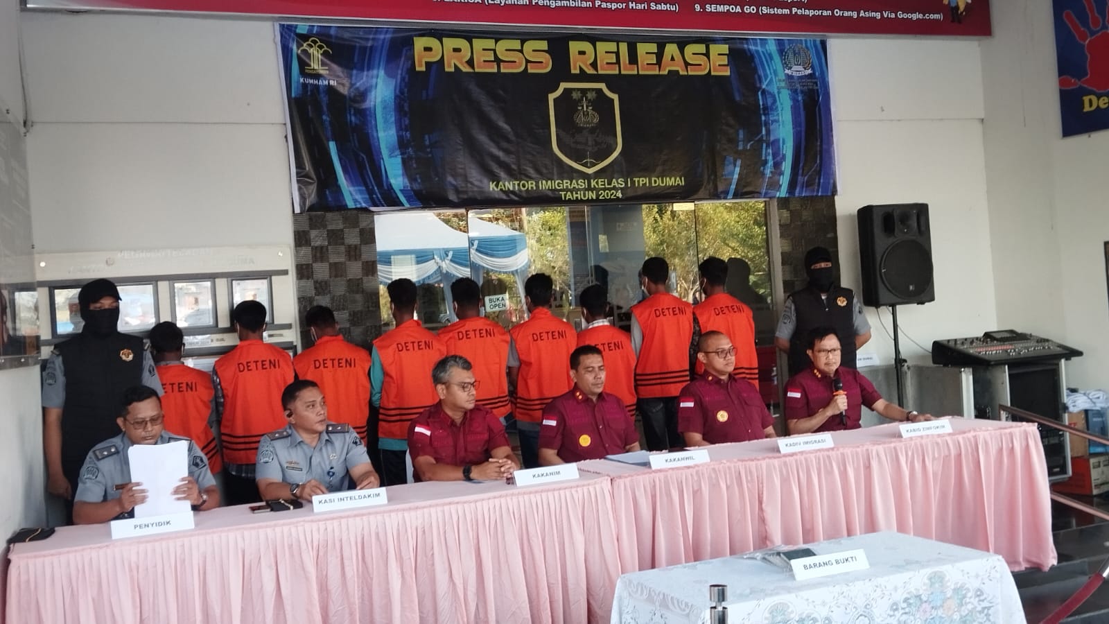 Dalam pres rilis, Sabtu (7/12/2024) di Kantor Imigrasi Dumai turut hadir pejabat Kemenkum Riau, kepala Imigrasi Kelas 1 TPI Dumai Ricky Rachmawan, Kepala Seksi Intelijen dan Penindakan Keimigrasian Kantor Imigrasi Dumai, Dianta Kita Sinuraya